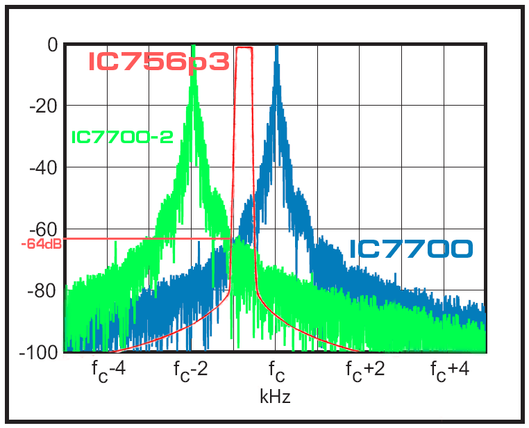 Типичная картина, хотя и во многом идеализированная: два IC7700 передают точки 60 WPM. Разнос между сигналами 2 кГц. Между их сигналами пытается что то принять IC756про3 с полосой пропускания 500Гц\-6дБ: